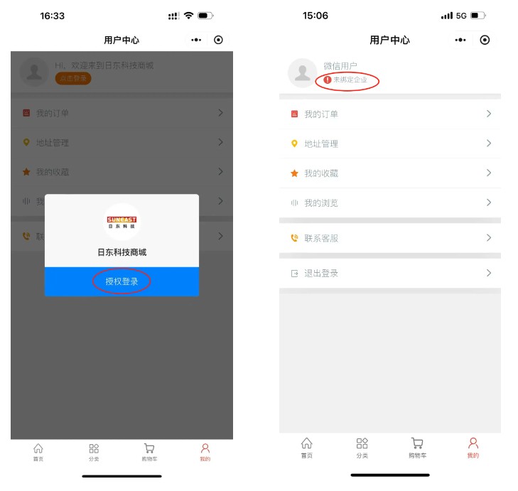 進(jìn)入首頁需先點(diǎn)擊-我的-點(diǎn)擊登錄-授權(quán)登錄 –綁定企業(yè),完善企業(yè)資料。詳細(xì)操作如下圖所示: