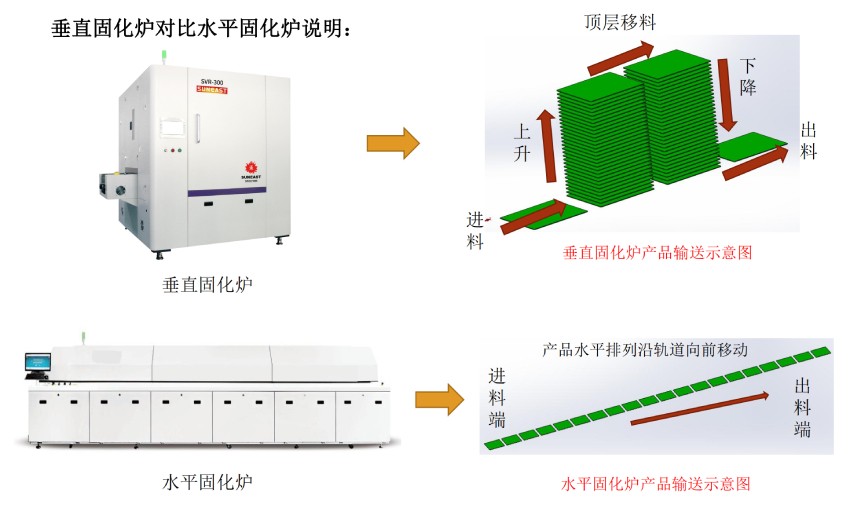 和水平固化爐相比,相同產(chǎn)能下,水平固化爐(產(chǎn)品水平排列存儲(chǔ))的長(zhǎng)度是垂直爐(產(chǎn)品垂直方向存儲(chǔ))的十多倍甚至更多。