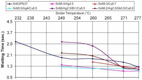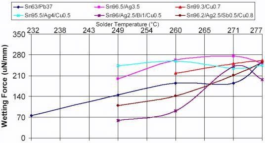 不同無鉛釬料在不同溫度下的潤濕力和潤濕時間